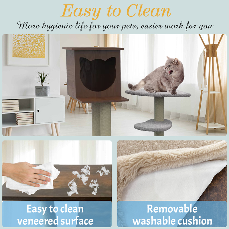 1. Kompozit szórakoztató tér: A kiválasztott, környezetbarát részecskemezből és a szizális oszlopokból készült macskafa kombinációja kielégíti a macska természetes ösztönét, hogy felmászjon és élelmiszert vadászjon, miközben rejtett és biztonságos magán pihenőhelyet biztosít.